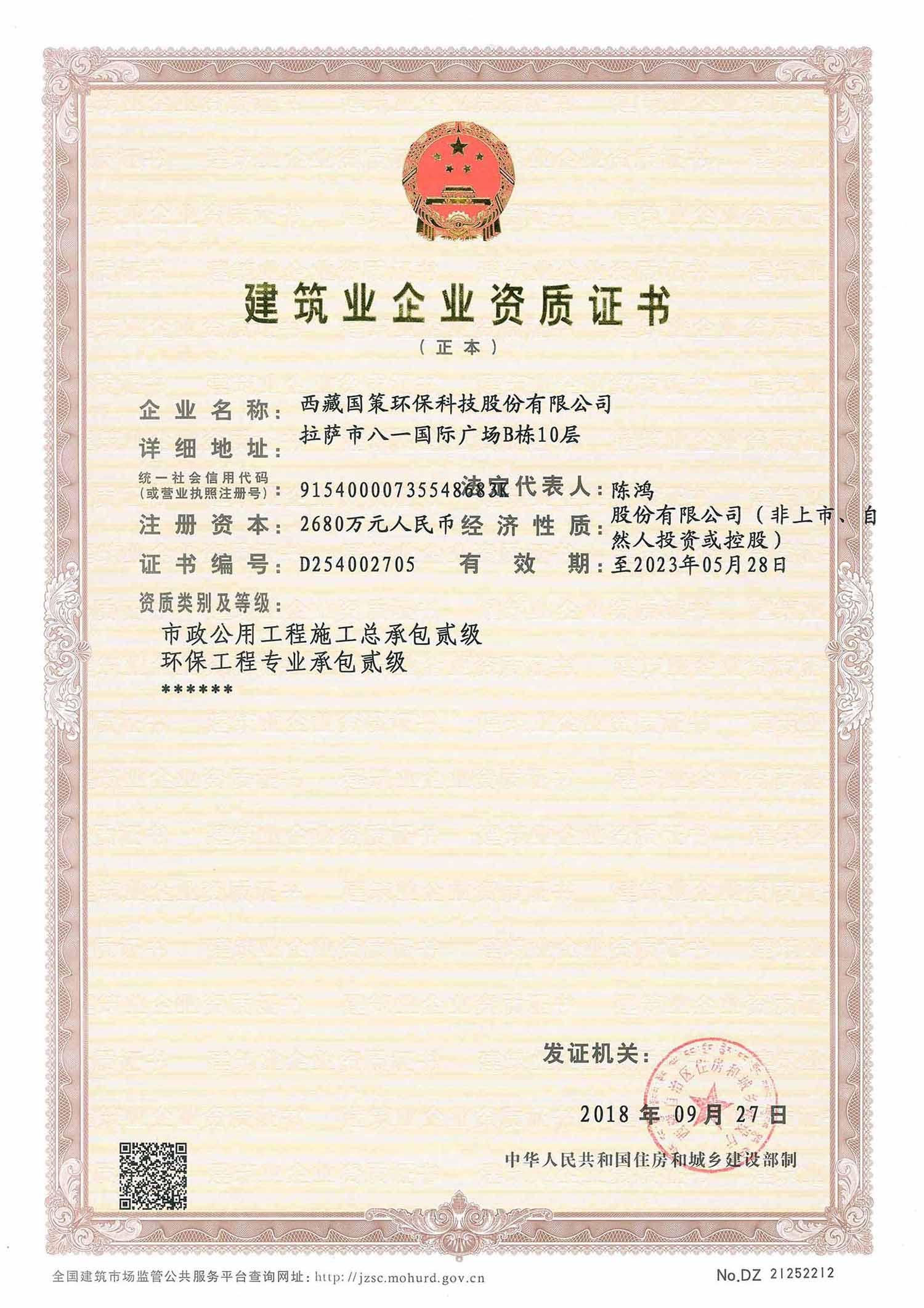 國(guó)策環(huán)保擁有住房和城鄉(xiāng)建設(shè)部頒發(fā)的建筑業(yè)企業(yè)市政公用工程施工總承包貳級(jí)資質(zhì)、環(huán)保工程專業(yè)承包貳級(jí)資質(zhì),同時(shí)擁有環(huán)保、市政、機(jī)電等各類專業(yè)工程技術(shù)人員共計(jì)40余人,并先后承擔(dān)了眾多污水廠、垃圾填埋場(chǎng)、自來(lái)水廠、醫(yī)療廢物處置中心等項(xiàng)目的施工任務(wù)。